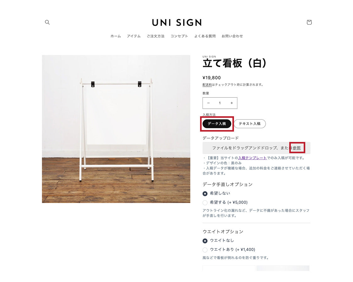 Adobe Illustratorなどのデザインソフトをご使用可能な場合は「データ入稿」を。ご使用できない場合は「テキスト入稿」をご選択ください。