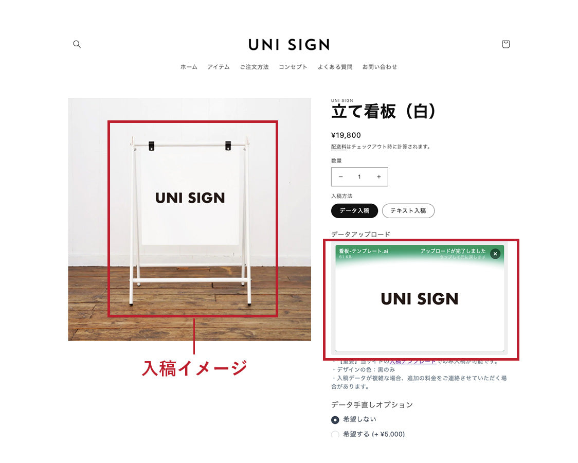 デザインデータをアップロードすると入稿イメージが表示されます。作成データと入稿イメージにお間違いがないかご確認ください。