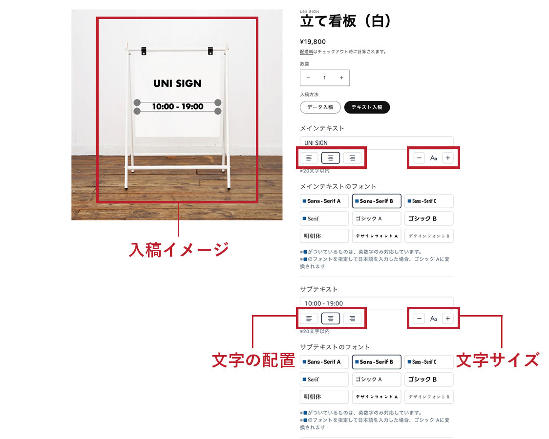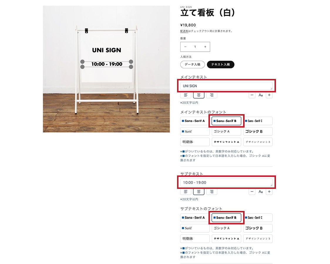 メインテキスト/メインテキストのフォント/サブテキスト/サブテキストのフォントの項目から文字をご入力いただき、ご利用になりたいフォントをご選択ください。