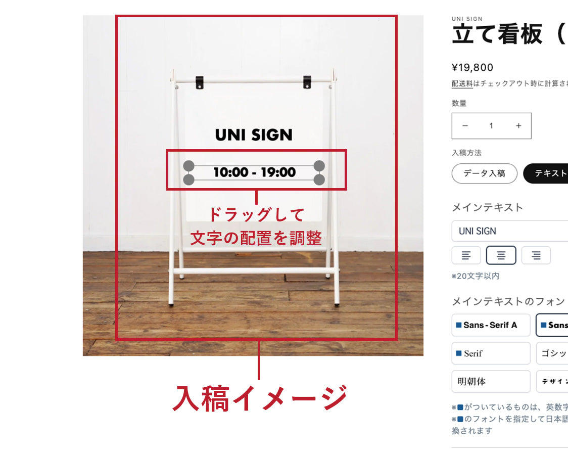 入稿イメージに反映されているテキストをご確認いただきながら、ご入力いただいたテキストの配置や文字サイズをご調整ください。